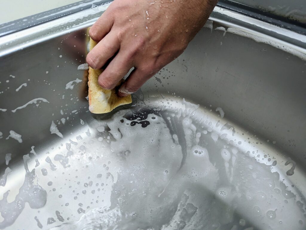 食器用スポンジ、もしくはメラミンスポンジに水を含ませ、中性洗剤を染み込ませシンク内全体を擦って汚れを落としましょう。