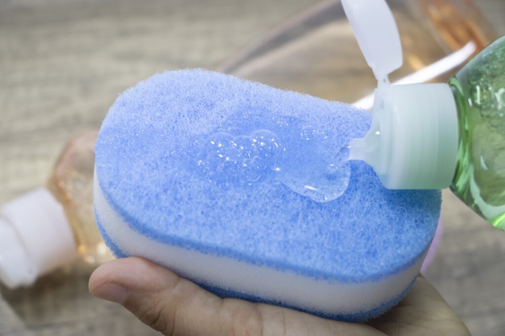 洗い流したら中性洗剤で塩酸を中和します。食器用スポンジに中性洗剤を染み込ませましょう。