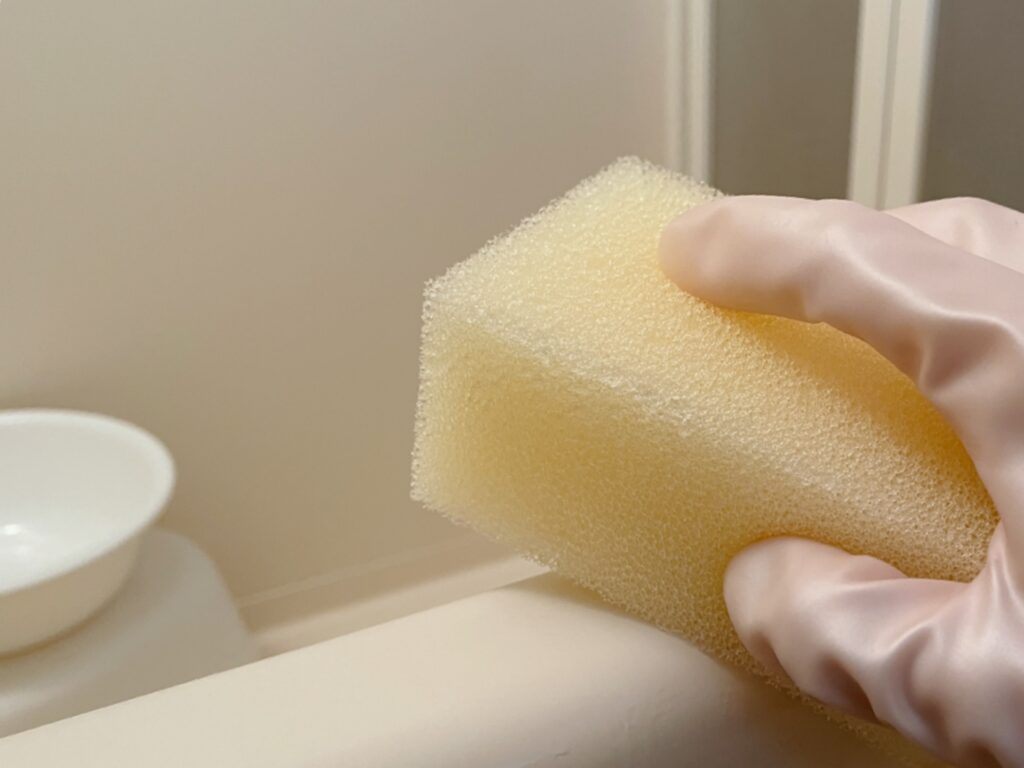 作業の仕方ですが、洗剤は必要ありません。メラミンスポンジを水で湿らせ、したたり落ちない程度までかるく絞りましょう。