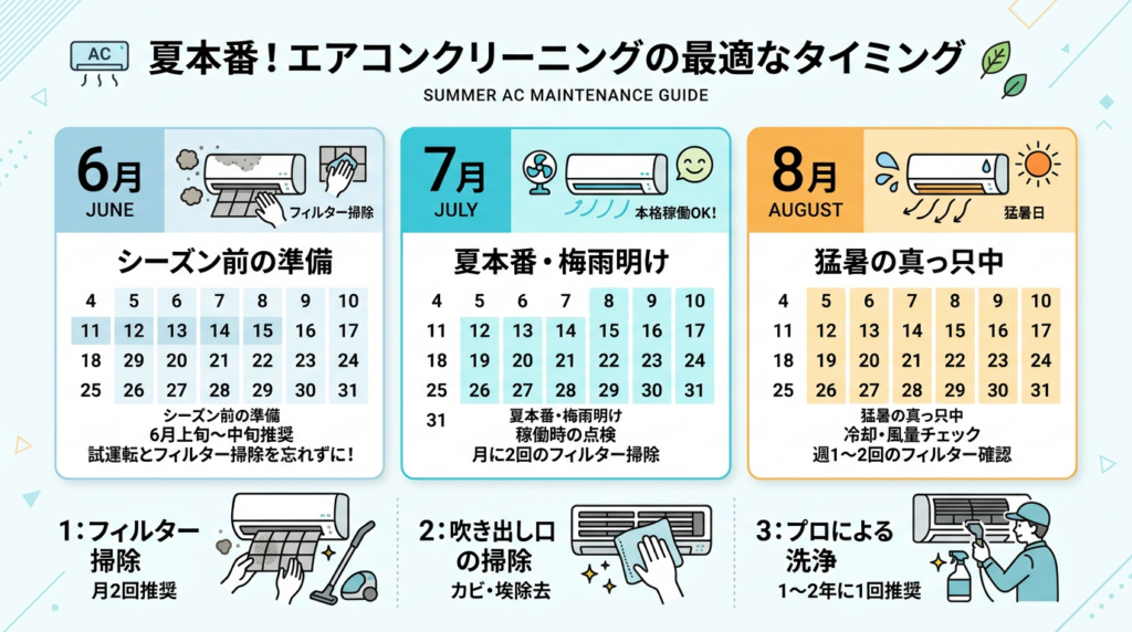 • 春(3〜5月): 冷房シーズン前に使い始めるエアコンをきれいにする