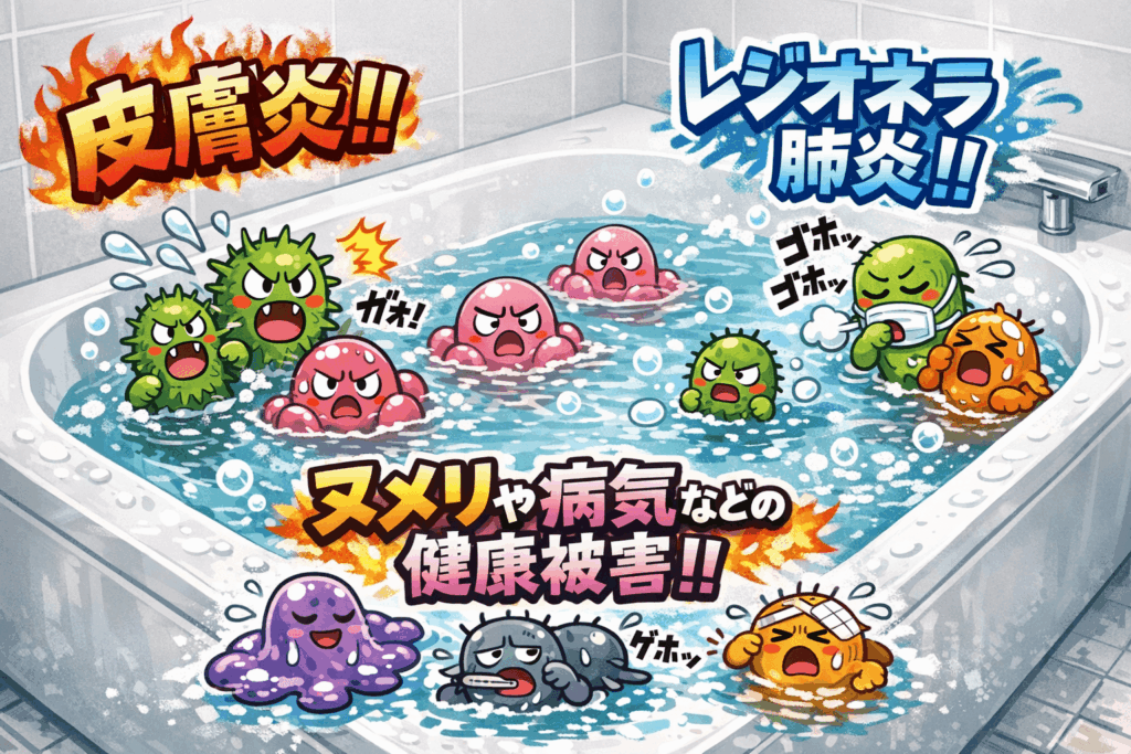 皮膚炎やレジオネラ肺炎などのリスクを高め、追い炊き配管は定期的な洗浄が必要です。