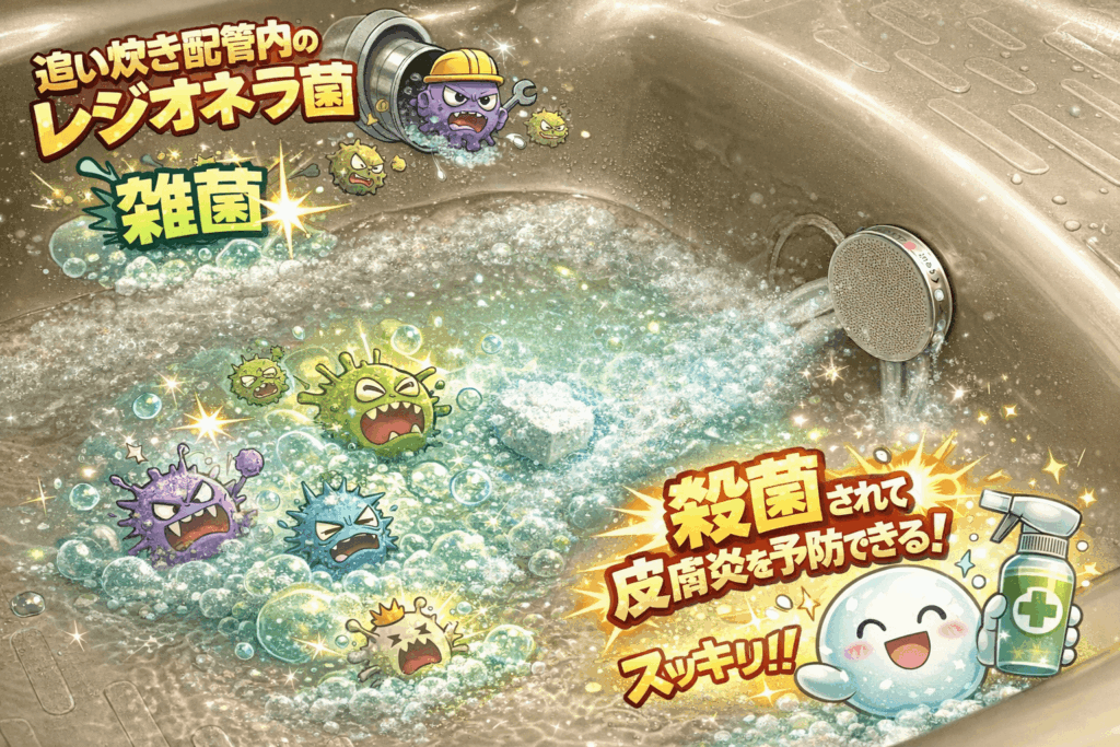 浴室の追い焚き配管には入浴剤、皮脂汚れ、水あか、雑菌などのレジオネラ菌や、大腸菌が溜まりやすく繁殖してしまいます。