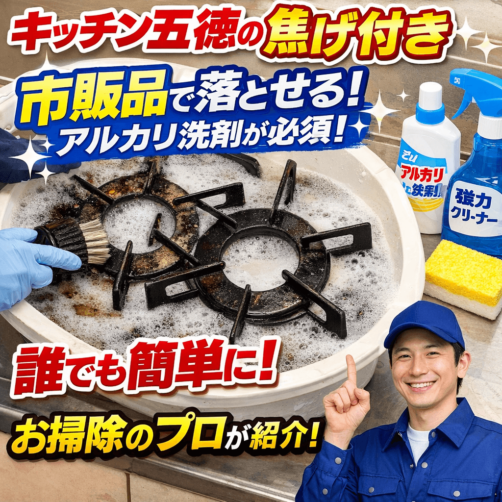 キッチン五徳の焦げ付き、市販品で落とせる!アルカリ洗剤が必須!誰でも簡単に、お掃除のプロが紹介