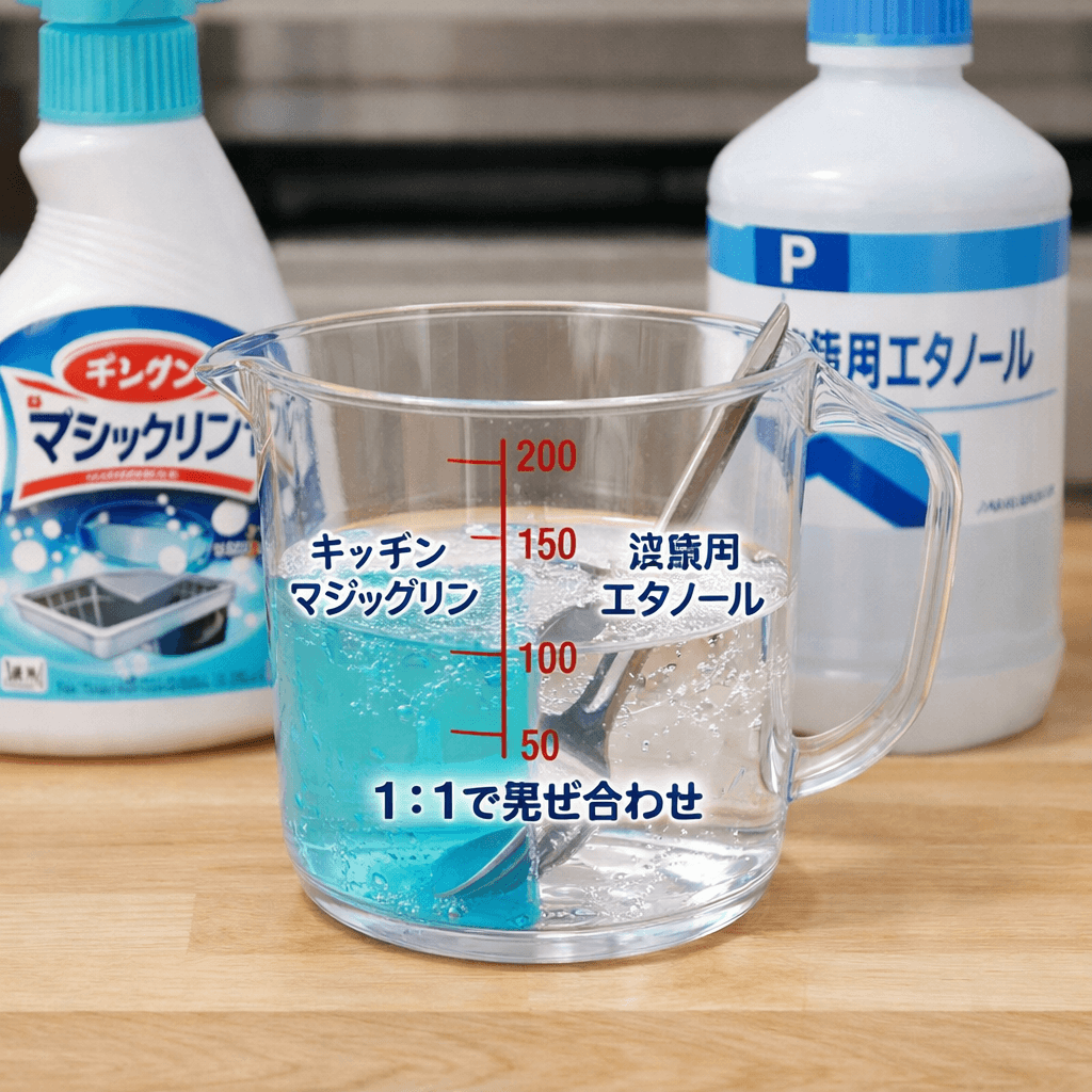 計量カップにキッチンマジックリンを入れ、消毒用エタノールを入れて混ぜ合わせましょう。